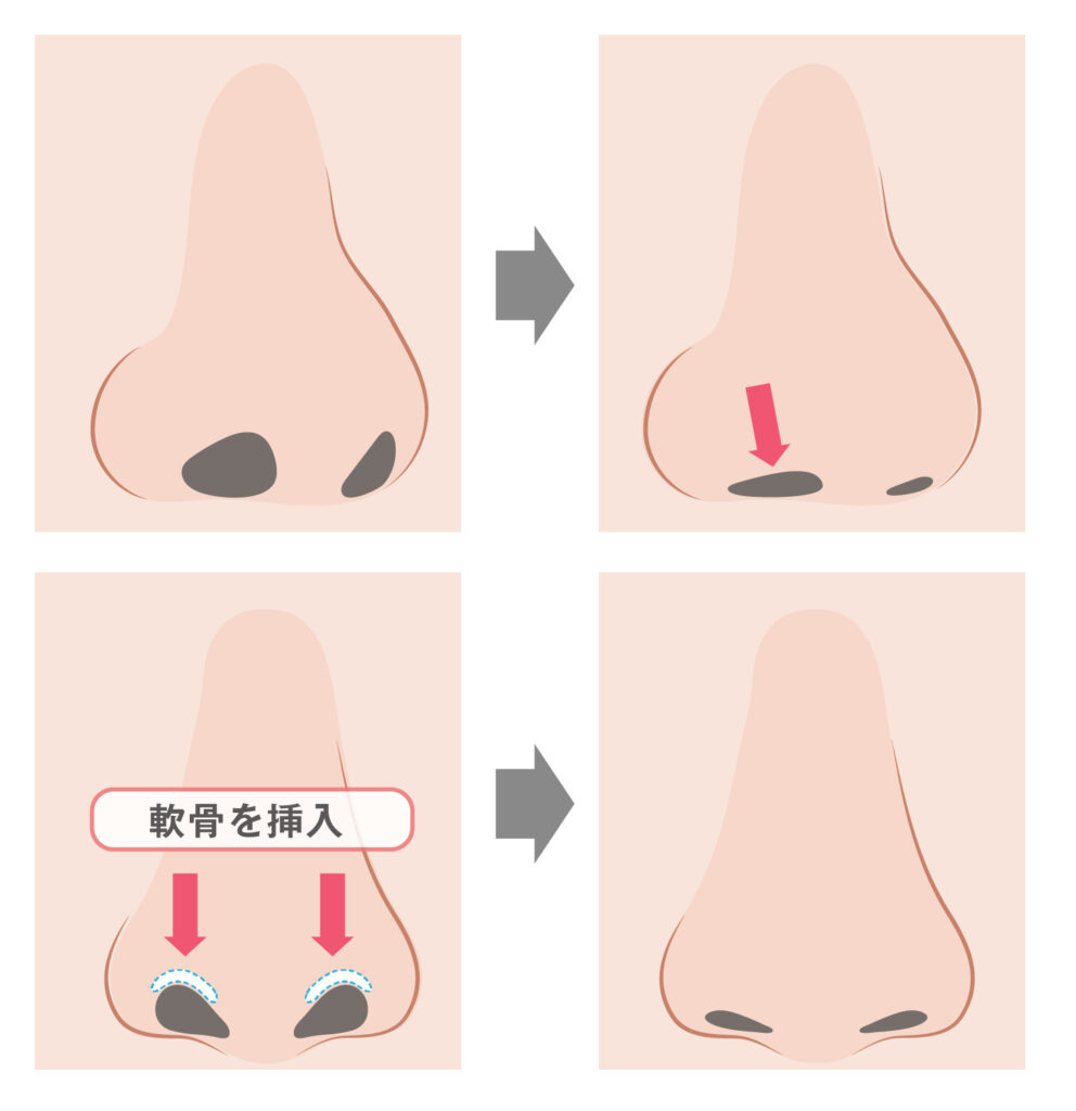耳などから軟骨を採取し、それを鼻孔縁に移植して継ぎ足すことで、鼻の穴の縦方向の面積が縮まり、鼻孔縁の位置は下方に移動します。