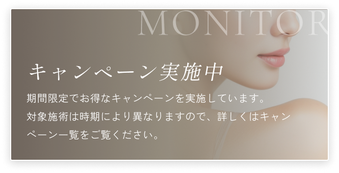 費用が気になって施術を迷っている方へ。当院の『モニター制度』なら、施術前後のお写真や体験談のご協力で通常よりお得に施術を受けられます。経験豊富な医師による施術で安心しながら、前向きに検討いただけます。まずは条件や対象施術をご確認ください。